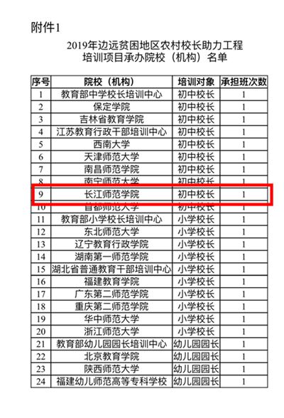 近日,教育部中小学校长及幼儿园园长国家级培训项目管理办公室发布通知,公布“校长国培计划”—2019年边远贫困地区农村校长助力工程培训项目承办院校(机构)名单,我校成功入选。这是我校第四次入选该项目承办院校,今年全国仅有24所培训院校(机构)入选初中、小学及幼儿园国培项目。