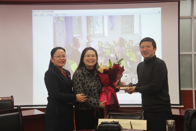仪式伊始,邱书记首先对朱渝老师多年来为教育事业和学校发展作出努力和贡献表示肯定和感谢。她表示,朱渝老师多年来工作勤勉严谨、踏实稳重,把自己的青春和热血都无私地奉献给了学校和她热爱的教育事业。接着,邱书记对朱渝老师荣休表示热烈祝贺并对朱老师退休生活表达美好的祝愿并送荣休纪念品和慰问品。