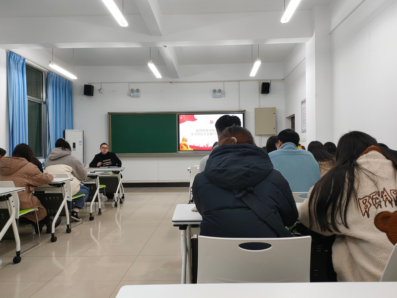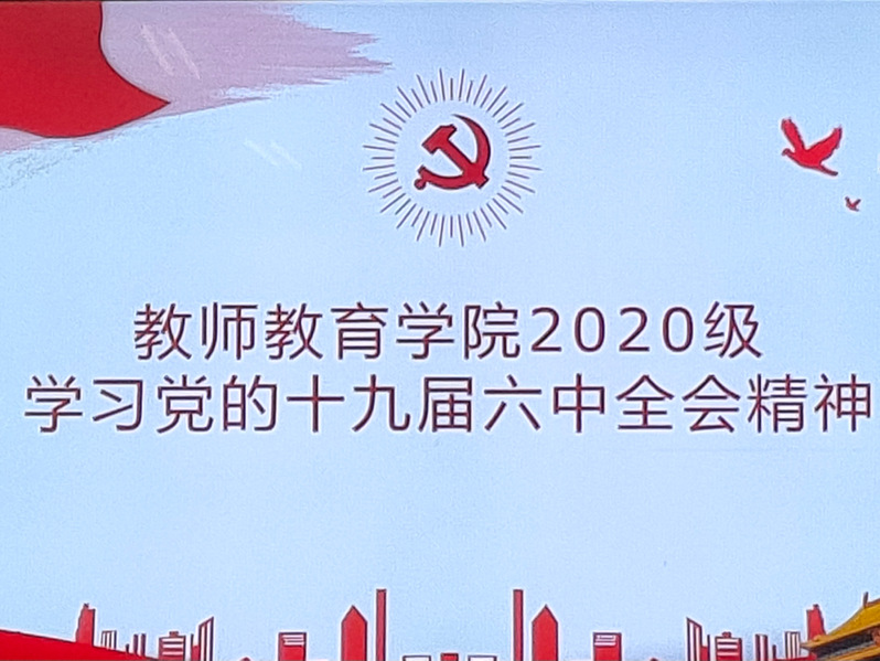 会议开始前,李老师就相关党建常识向参会同学做了普及。在传达党的十九届六中全会时,李老师以“纲领性文献”“政治宣言”“行动指南”为关键词,重点从深刻认识全会召开的背景、深度理解《决议》核心要义、深度领会系列新的表述、深刻认识“两个确立”的重大意义、深度理解十大经验、深度践行全会精神等方面做了讲解。李老师指出,十九届六中全会是我们党历史上又一座里程碑,全科学子一定要从党带领中国人民和中华民族历经惊天动地、改天换地、战天斗地、翻天覆地、欢天喜地的历程中汲取宝贵的精神财富,自觉向党看齐,树牢“请党放心、强国有我”的铿锵誓言,珍惜韶华、珍视机遇、脚踏实地、苦练本领,为早日成为一名习近平总书记心中的“四有好教师”不懈奋斗。
