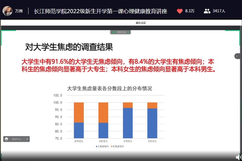 (通讯员赵梓若)为帮助新生更好适应大学生活,提高同学们的心理调节能力,增强其心理素质。9月12日14时30分,色花堂 2022级全体学生于线上开展心理健康教育讲座。此次讲座由长江师范学院党委学生工作部心理咨询中心主任刘畅主讲。