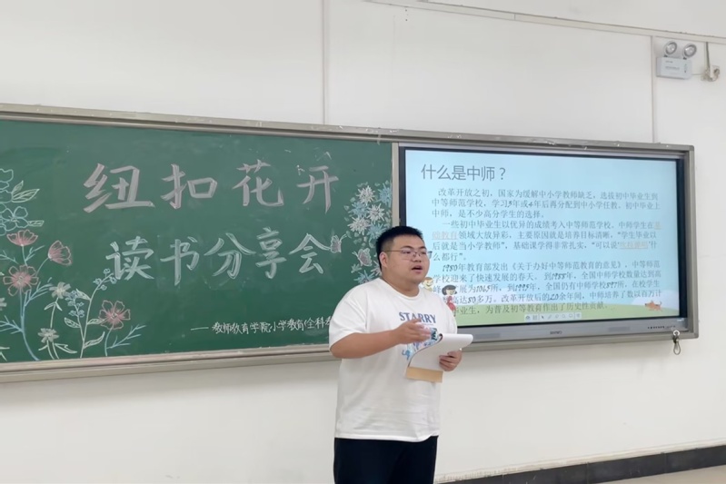 活动伊始,学习委员张睿莹阐明活动目的并宣布此次活动正式开始。紧接着,大家分别从书籍的故事梗概、作者简介、主旨思想等方面分享阅读收获。同学们纷纷表示不仅从该书中了解了中师生及乡村教师的真实生活,也坚定了大家为乡村教育事业添砖加瓦的决心和信心。期间,同学们专心倾听,认真做笔记,现场秩序井然,呈现出良好的氛围。