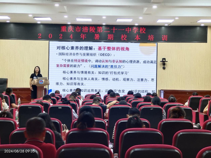 8月28日,色花堂 董静教授受邀为重庆市涪陵第21中学全体教师进行暑期校本培训,董静教授以“核心素养下的教学变革”为专题,围绕“核心素养是什么”“核心素养导向下教师如何教”以及“核心素养导向下教师教学能力的提升”三个方面与全体教师进行了充分的交流。核心素养的落地,关键在于教师对核心素养的理解和教学行动的转化。本次培训帮助一线教师进一步厘清了核心素养导向下的教学观念,为教学行动的改善指明了方向。