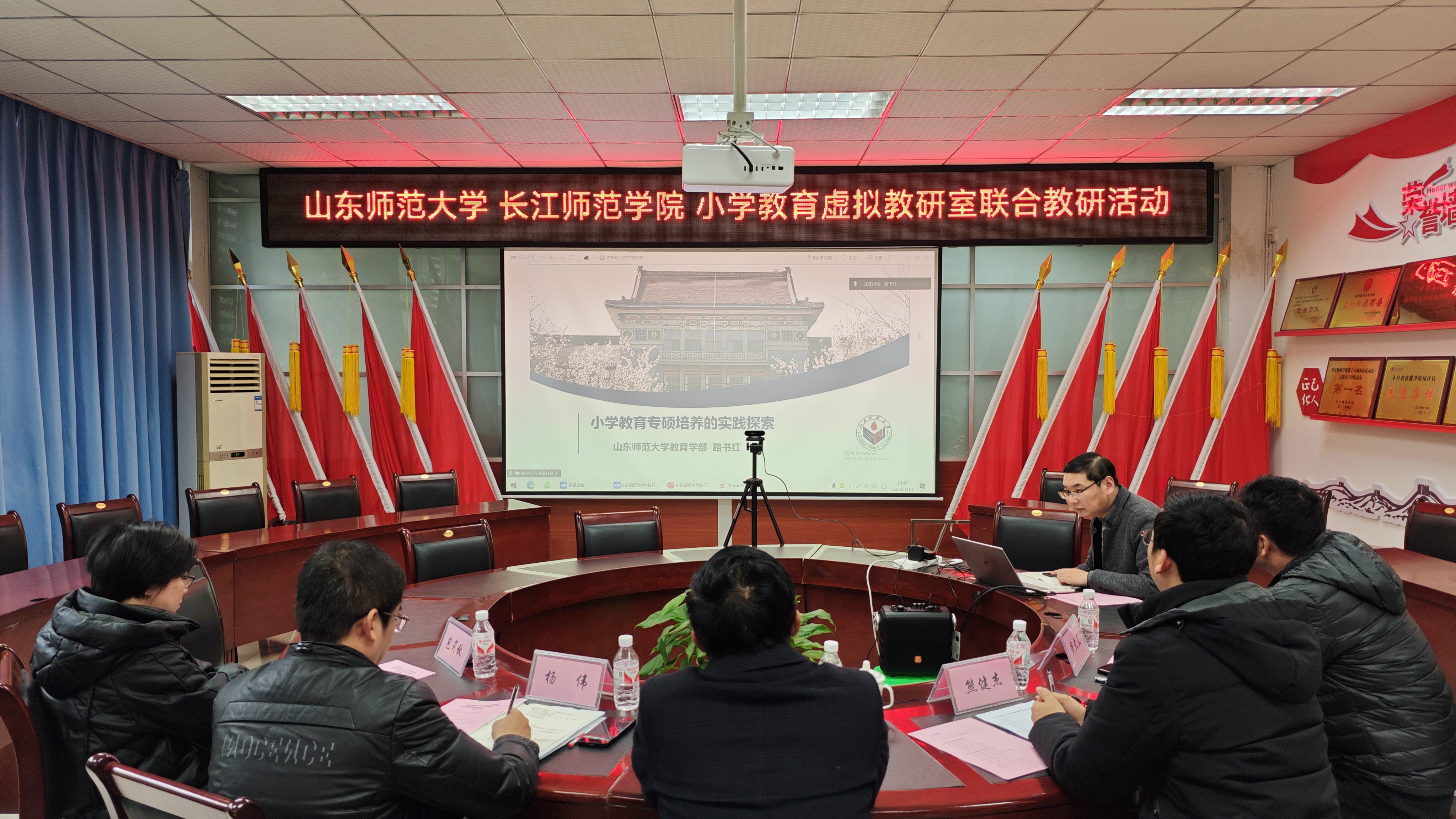 2025 年 1 月 13 日下午15点,一场跨越千里的教育智慧碰撞,在腾讯会议平台上热烈展开。山东师范大学与长江师范学院小学教育虚拟教研室首次联合教研活动,以“专业课程建设系统化育人探索” 为主题,成功搭建起交流合作的桥梁,致力于为小学教育专业课程建设注入全新活力。