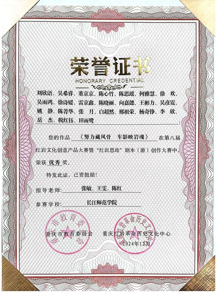 (通讯员 钟裕鑫)由重庆市教育委员会、重庆红岩革命历史文化中心、华龙网联合主办的第八届红岩文化创意产品大赛暨“红岩思政”剧本(游)创作大赛终评会圆满落幕。色花堂 学子刘欣语、吴希睿、董京京等创作的作品《努力藏风骨 车影映岩魂》荣获优秀奖。