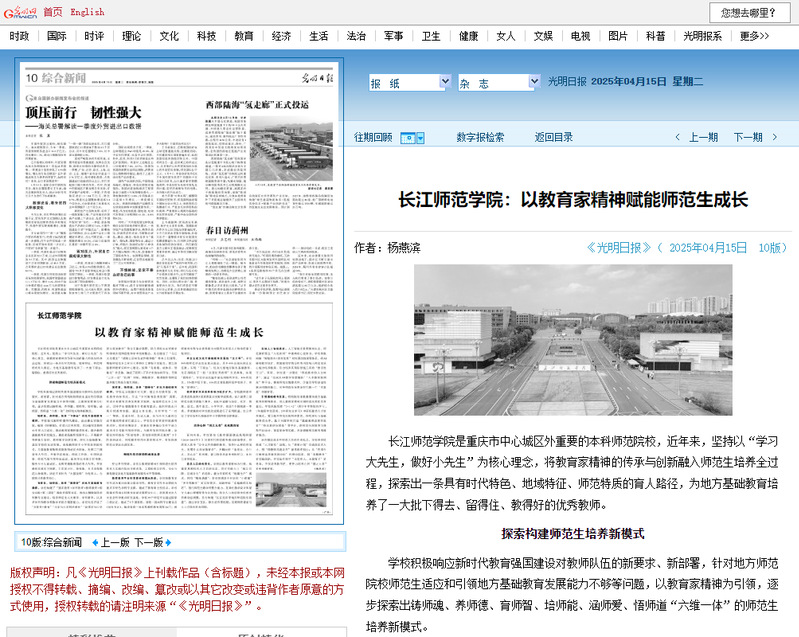 《光明日报》 长江师范学院:以教育家精神赋能师范生成长