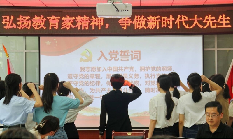 活动在庄重的红色传承仪式—— 党员徽章接力中拉开帷幕。杨燕滨校长和教师党员亲手为毕业生党员佩戴党徽,传递党的信任与期望;毕业生党员随即为新发展党员代表佩戴党徽,象征着红色基因的代代相传。这一枚枚党徽,不仅是身份的标识,更承载着责任与使命的延续。随后,新党员进行庄严的入党宣誓,毕业生党员重温入党誓词,杨燕滨校长领誓,铿锵有力的誓言回荡在会场,坚定了每一位党员为共产主义事业奋斗终身的决心。