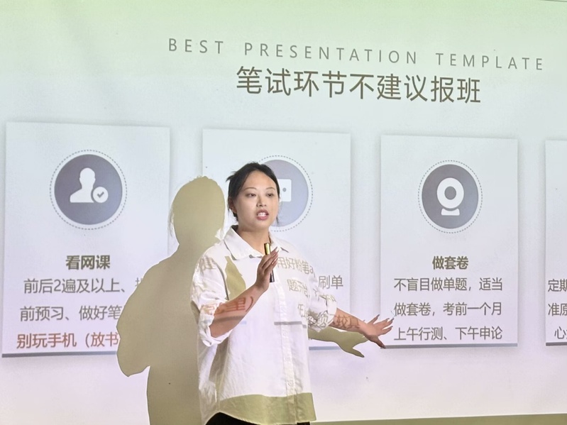 分享过程中,江星月分别从考什么,如何备考以及学生互动三个方面给学生分享了考公的相关经验。她告诉学生国考要考行测,申论,职业能力倾向测验和综合应用能力学。生应当提前备考,在备考期间要多刷题多看网课,并定期复盘,找到错误的点,同时她还推荐了许多名师和相关的APP,确保学生高效备考。最后在互动环节中,她提醒学生考公是自己一个人的事情,在备考期间一定要坚持,保持良好的心态,注意身体健康,最终一定会有不错的结果的。
