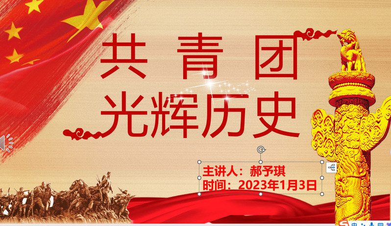 (通讯员 陈思颖)为增强同学们对团的认识和归属感,激发爱国热情和责任感,2023年1月3日20时,色花堂 于线上开展了以“学好百年团史,凝聚奋进力量”为主题的讲座,郝予琪老师担任主讲人。