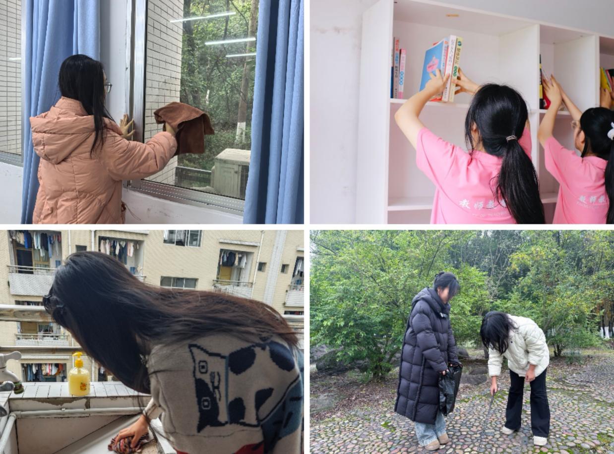 环境焕新行动是本次系列活动的重要内容。学生会组织工作人员化身校园美容师,深入晚自习教室、学生寝室、青马工程活动室开展清扫工作。大家手持扫帚、抹布等清洁工具,分工协作、干劲十足,细致清理地面垃圾、擦拭门窗桌椅、规整物品摆放,不放过任何卫生死角。同时,工作人员还对学院工区、图书角进行全面保洁与整理,将图书分门别类归置到位,让学习空间更加窗明几净、井然有序,为同学们打造了整洁舒适的学习生活与交流阵地。