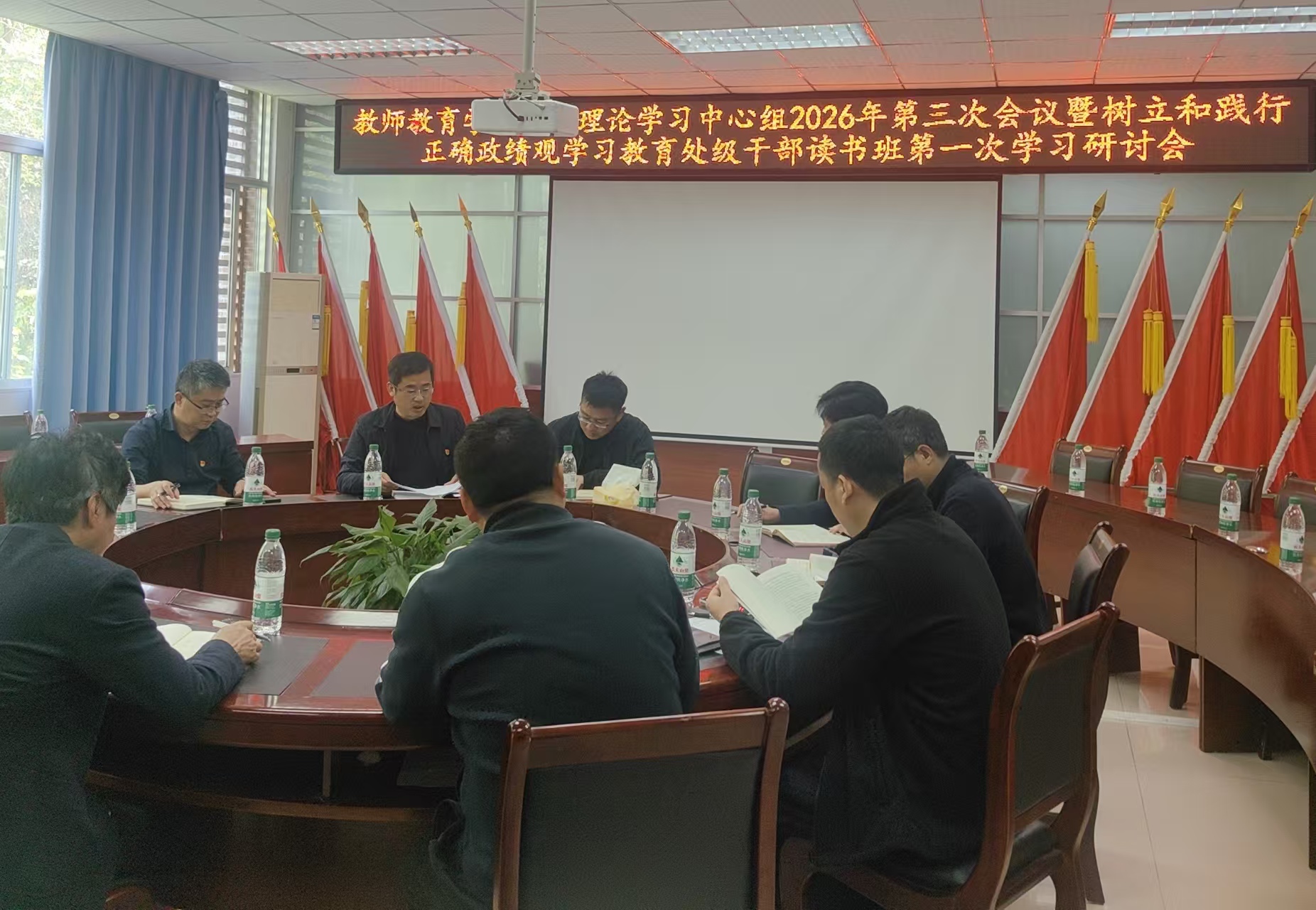 48日上午,学院在崇仁楼408会议室召开党委理论学习中心组2026年第三次学习会暨树立和践行正确政绩观学习教育处级领导干部读书班第一次学习研讨会。学院党委书记杨伟主持会议。