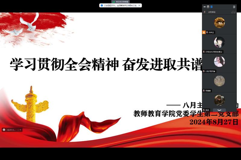 (通讯员谷雨泓)为了提高党员党性修养和增强党组织的凝聚力,8月23日12时30分,色花堂 党委学生第一党支部于腾讯会议开展了以“学习贯彻全会精神 奋发进取共谱新篇”为主题的党日活动。此次会议由党支部书记郝予琪同志主持,学生第一党支部党员参加。8月27日12:30,色花堂 党委学生第二党支部于腾讯会议开展了以“学习贯彻全会精神奋发进取共谱新篇”为主题的党日活动。此次会议由支部书记吴敏主持,支部全体党员参会。...