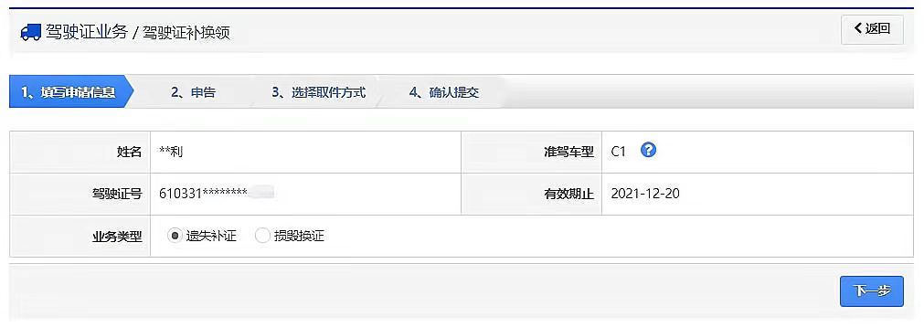 在该步骤,系统会判断用户可办理的驾驶证补换领业务类型并提供给用户选择,用户选择需要办理的业务后点击【下一步】。