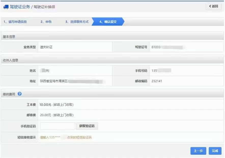 在该步骤,用户选择领取方式是邮政寄递或窗口自取。业务成功受理后,如果选择邮政寄递的,邮政人员将上门交付机动车驾驶证及收费票据。如果选择窗口自取的,则自行到选择的自取网点窗口领取机动车驾驶证。