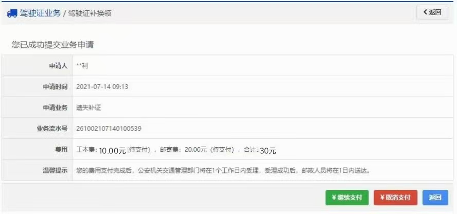 该步骤显示用户的驾驶证信息、领取详情以及需要缴纳费用信息,如果平台已开通在线支付功能,显示在线支付详情。