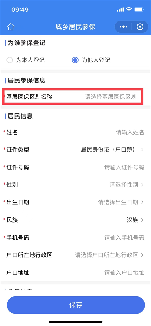 2.按要求填写基本信息(带*项为必填项),点击【基层医保区划名称】,地点切换成参保地县、区,【搜索栏】填入乡镇或街道名称,如户籍在“开元街道”,填写“开元”并点击【搜索】,下拉框选定户籍所在社区/村,完成居民信息填写并上传户口簿色花堂、户主页和参保人页后保存即可。