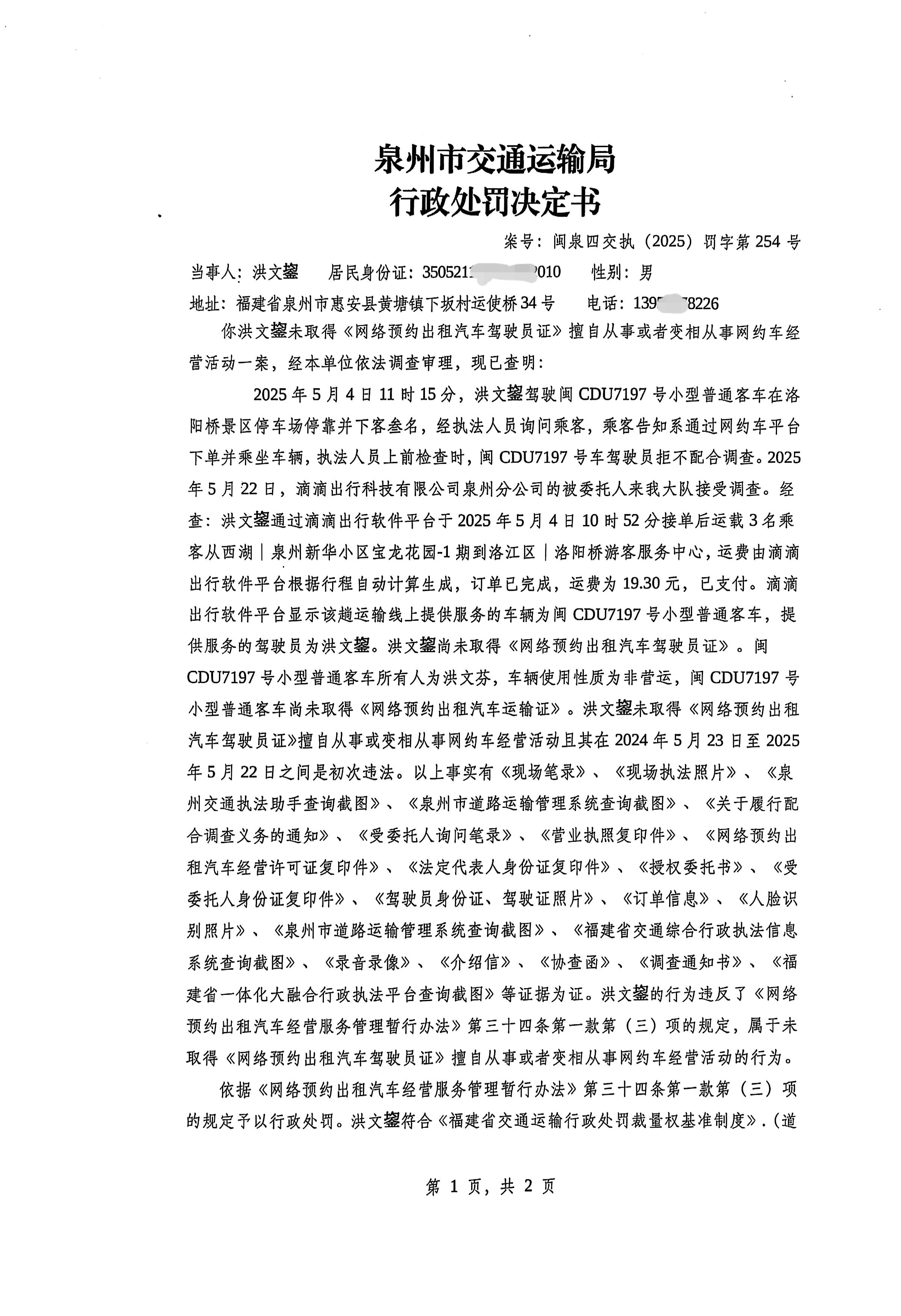 附件:《行政处罚决定书》(闽泉四交执(2025)罚字第254号)