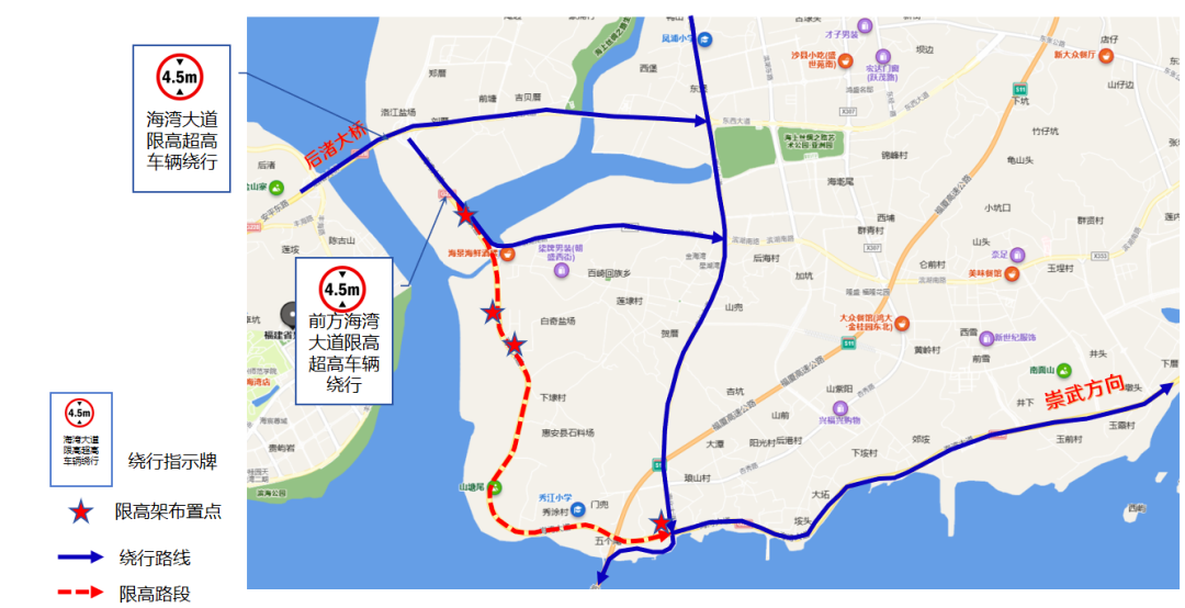 交警部门同时发布了相应的分流措施,(一)建议泉州市区、晋江、南安往崇武方向过境交通:①由后渚大桥→东西大道→南北大道→海湾大道绕行;②由后渚大桥→海江大道→海湾大道辅道→滨湖南路→南北大道→海湾大道绕行。